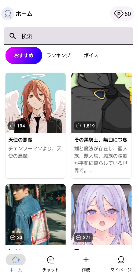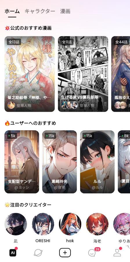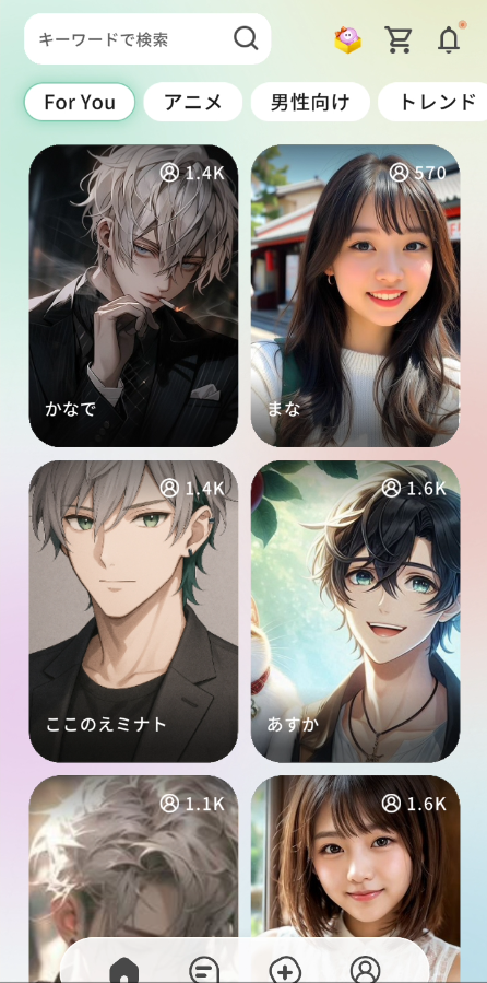 ユーザーが自由にキャラを作れるのが強み。ただし裏を返すと、いいキャラに出会うには自分で作るか、他ユーザーの作品を探す手間がかかるのが正直なところ。最初からキャラが揃っているAimaやCotomoとはアプローチが違います。