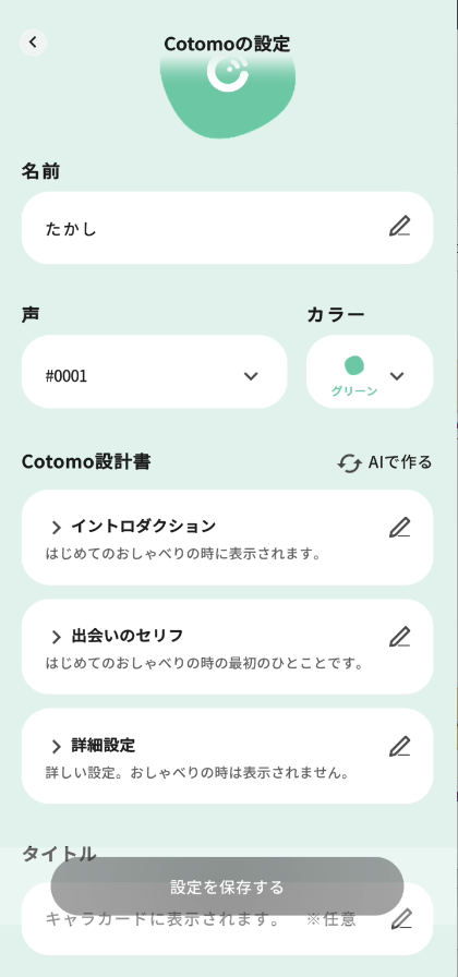 ①キャラを自分で作らないといけない——名前、性格、口調を「設計図」で設定する必要がある。イントロダクション、出会いのセリフ、詳細設定…と項目が多くて、キャラ設定を考えるのが苦手な人にはかなりハードルが高い。