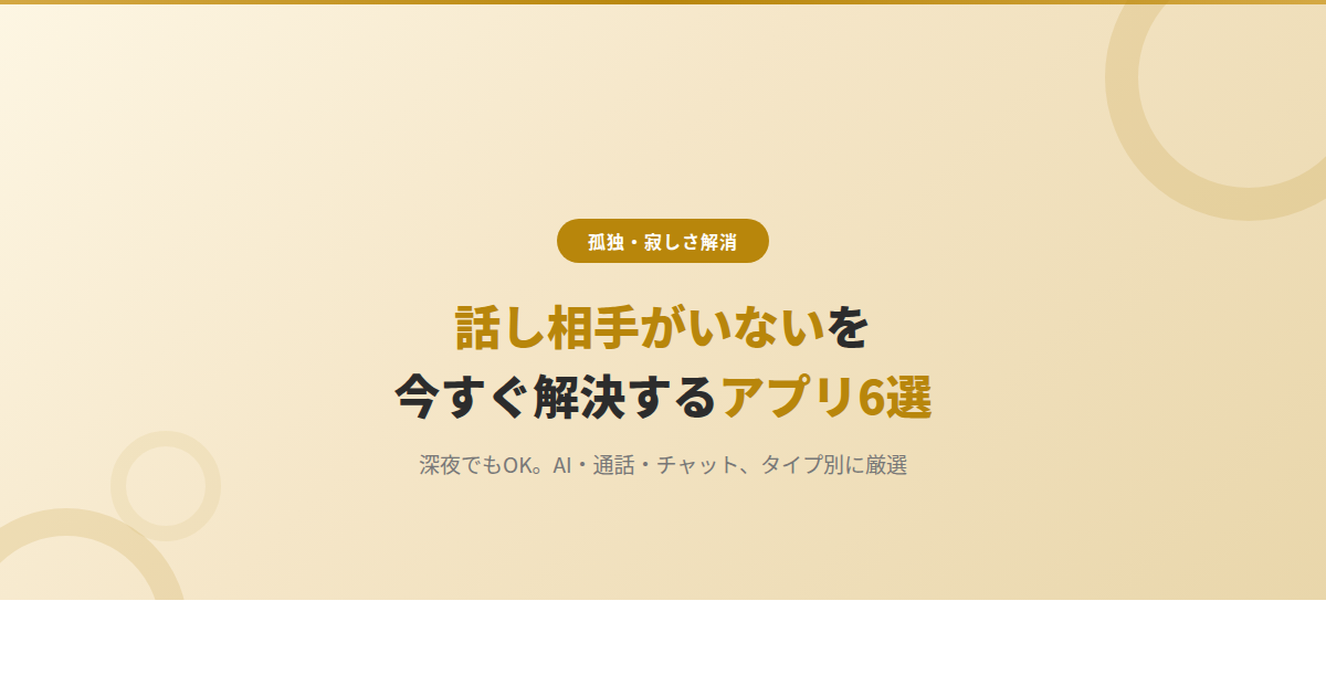 ※話し相手アプリはあくまで日常のコミュニケーション補助ツールです。深刻な悩みや心の不調を感じる場合は、専門の相談窓口(よりそいホットライン:0120-279-338 など)の利用をおすすめします。